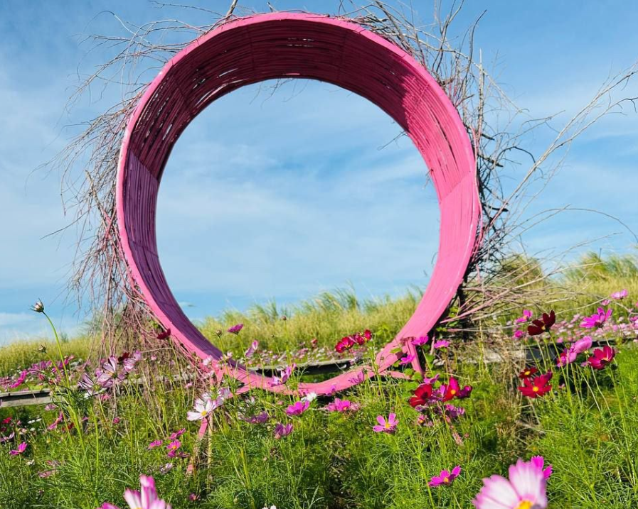Now? They walk straight toward the pink rings. The structure acts as a perfect frame for portraits. Kids love running circles around them. The bright pink contrasts beautifully with the soft purple cosmos flowers. From certain angles, the rings look like they are floating in mid-air.