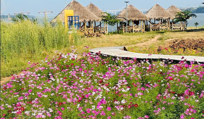 Right at the entrance, we packed in our brightest flowers—zinnias, cosmos, marigolds. We put the rainbow heart photo frame here, too. This zone has ONE job: make people go “Whoa” and pull out their phones.
